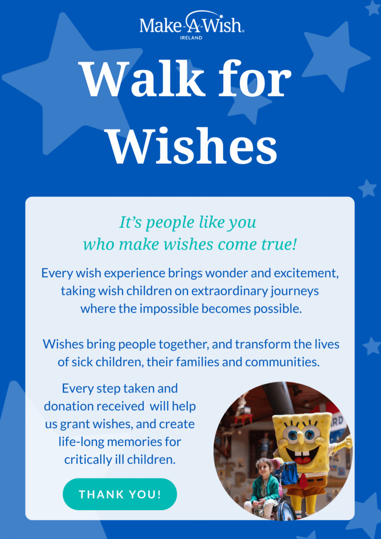 Thank you for signing up to our Walk For Wishes challenge! We are excited for you to join the team and help us to grant more incredible wishes to deserving children across the country. A member of our fundraising team will be in touch shortly to help you set up your walk for wishes fundraiser.