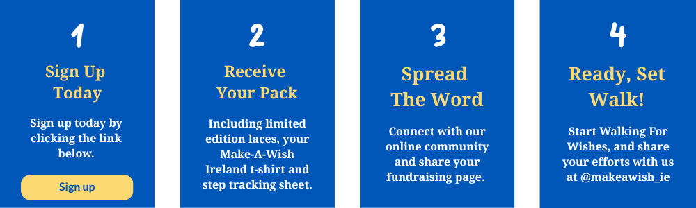 Walk For Wishes is a fundraising challenge where participants walk 100km in a month to support our wish children. Kickstart your month with an active fundraiser to get you moving and help children with critical illnesses across Ireland. Whether you choose to walk, run, or hike, we have everything you need to help you enjoy your event, reach the finish line, and support life changing wishes. Together we can bring hope and joy to those who need it most. Sign up below to receive your Walk For Wishes fundraising pack, including limited edition laces, a Make-A-Wish t-shirt and a step tracking sheet.