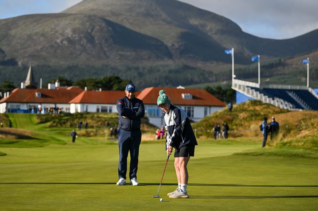 Next, they walked down to the first hole where they were greeted by Padraig! Danny got to chat to Padraig about their shared passion of golf and receive some tips from the pro himself. As Padraig got to the first green, he turned around and handed his putter to Danny! It was time to put Padraig’s advice to use, and Danny stepped up and sank the putt with no mistake! All the practise with his dad in the weeks before were clearly paying off! He again stepped up on the second hole and sank a much more difficult putt, with the crowd erupting in cheers. It was a special moment for Danny as Padraig celebrated with him.